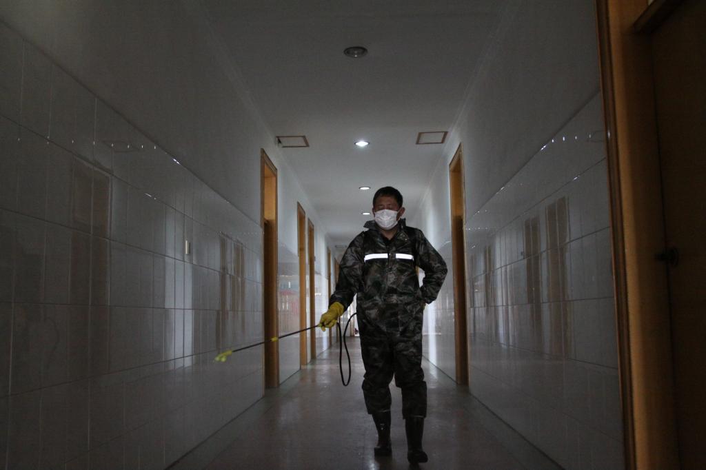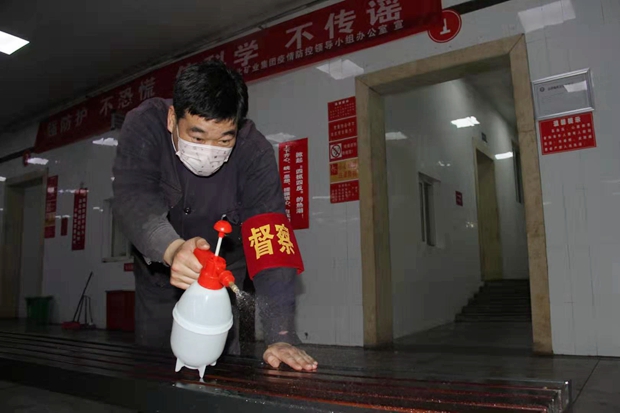 該礦物業科衛生隊黨員劉洋,背著噴霧器每4小時一次對辦公樓走廊、職工宿舍、衛生間及所屬崗位進行消毒,對食堂等關鍵重點場所每日不少于3次消毒。(王亮 陳更)