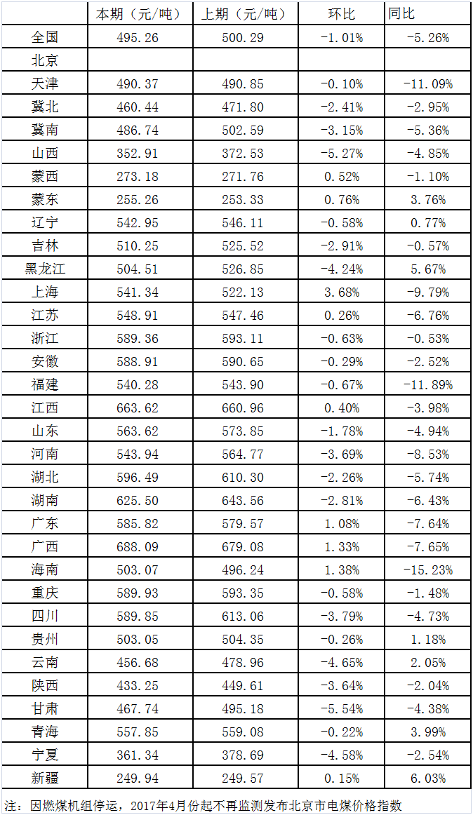 2019年5月15日,國家發展改革委價格監測中心公布4月中國電煤價格指數為495.26元/噸,環比下行1.01%,同比下降5.26%。其中,監測的31個省市(不含北京市)中,價格下行地區數量有22個,下行幅度減弱至27.44元/噸以內;其他9個地區電煤價格全部上行,漲幅上行至19.21元/噸以內。本月全國煤炭價格活動范圍整體上移,且煤炭價格上下行地區數量比例基本維持,說明價格下行區域活力減弱,而上行幅度擴大。